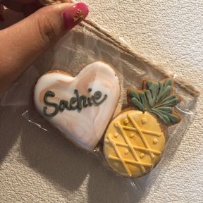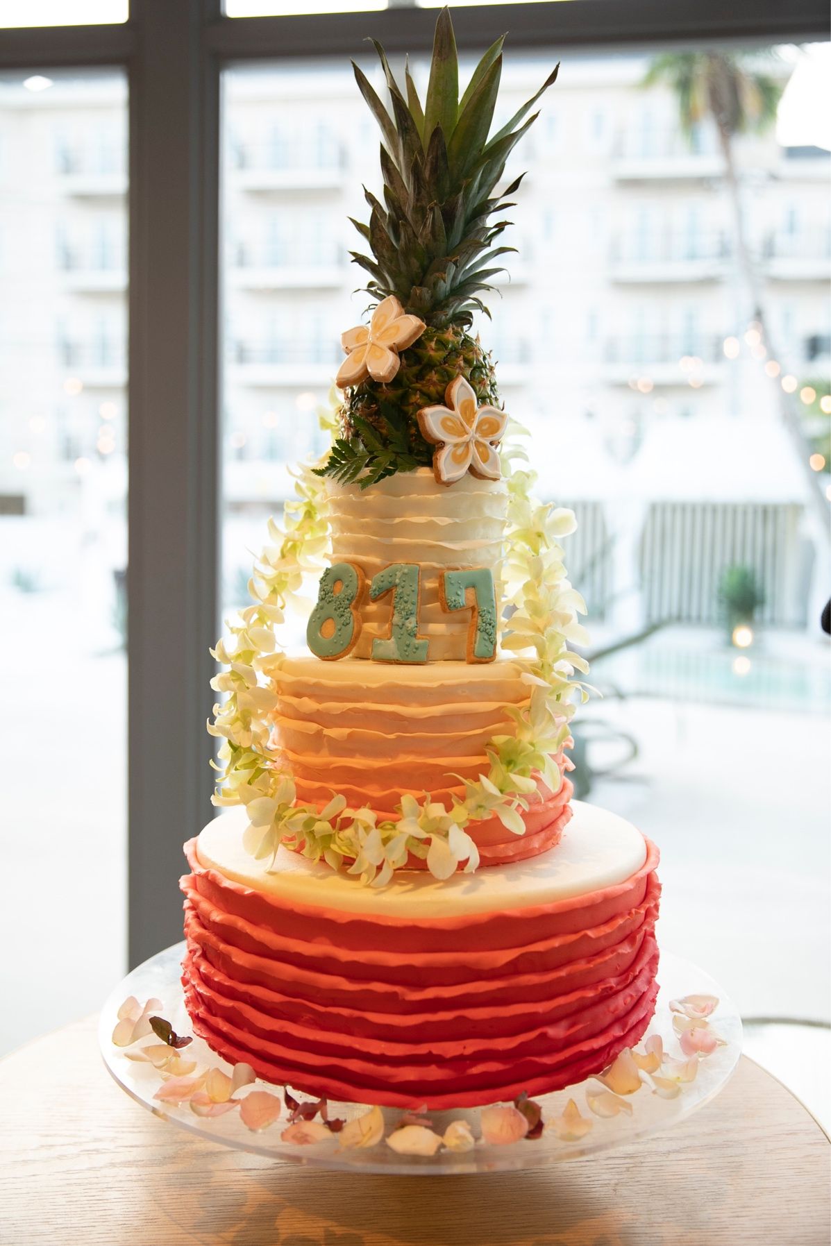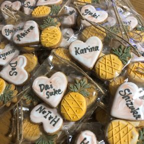 パイナップルをドーンと乗せてアイシングクッキーで日付とプルメリアを飾りました。