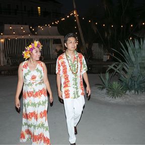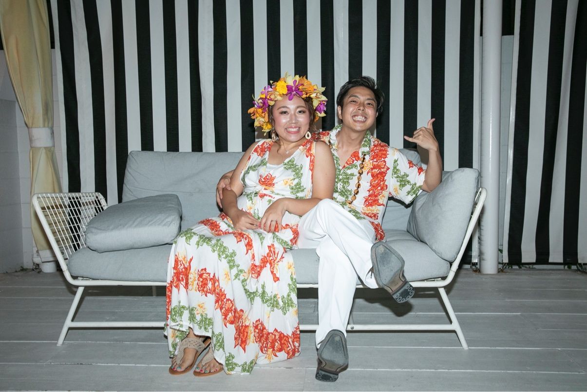 トロピカルウェディングをイメージしていたので、お色直しはトロピカルなアロハシャツとサッシュスカート にしました。