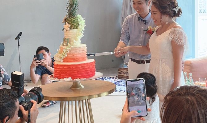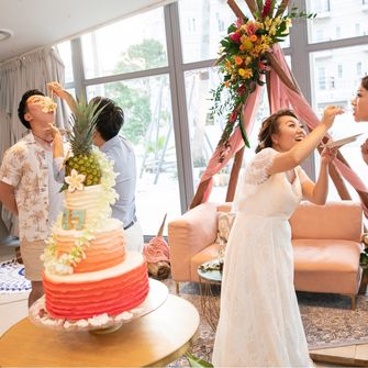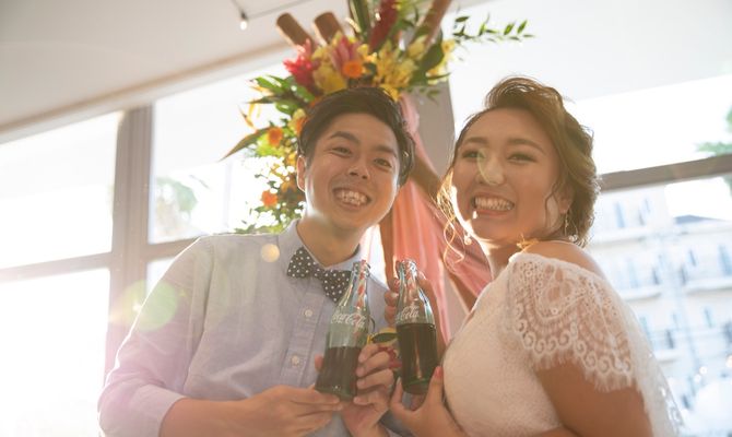 ハワイアンな雰囲気や、海がだいすき!個性的で、インスタ映えにこだわって、ゲストの人にも楽しんでもらえるような式にしました\(◡̈)/#平井大#トロピカル#ビーチ#コーラ#シンプソンズ#チュッパチャップス#パイナップル#リゾート挙式