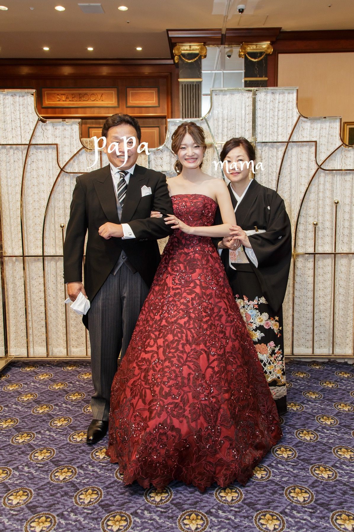 可愛くなりすぎない大人っぽいバーガンディのお色の刺繍が入ったドレスです。会場にとても映えて、スタイル良く見えるところもお気に入りです