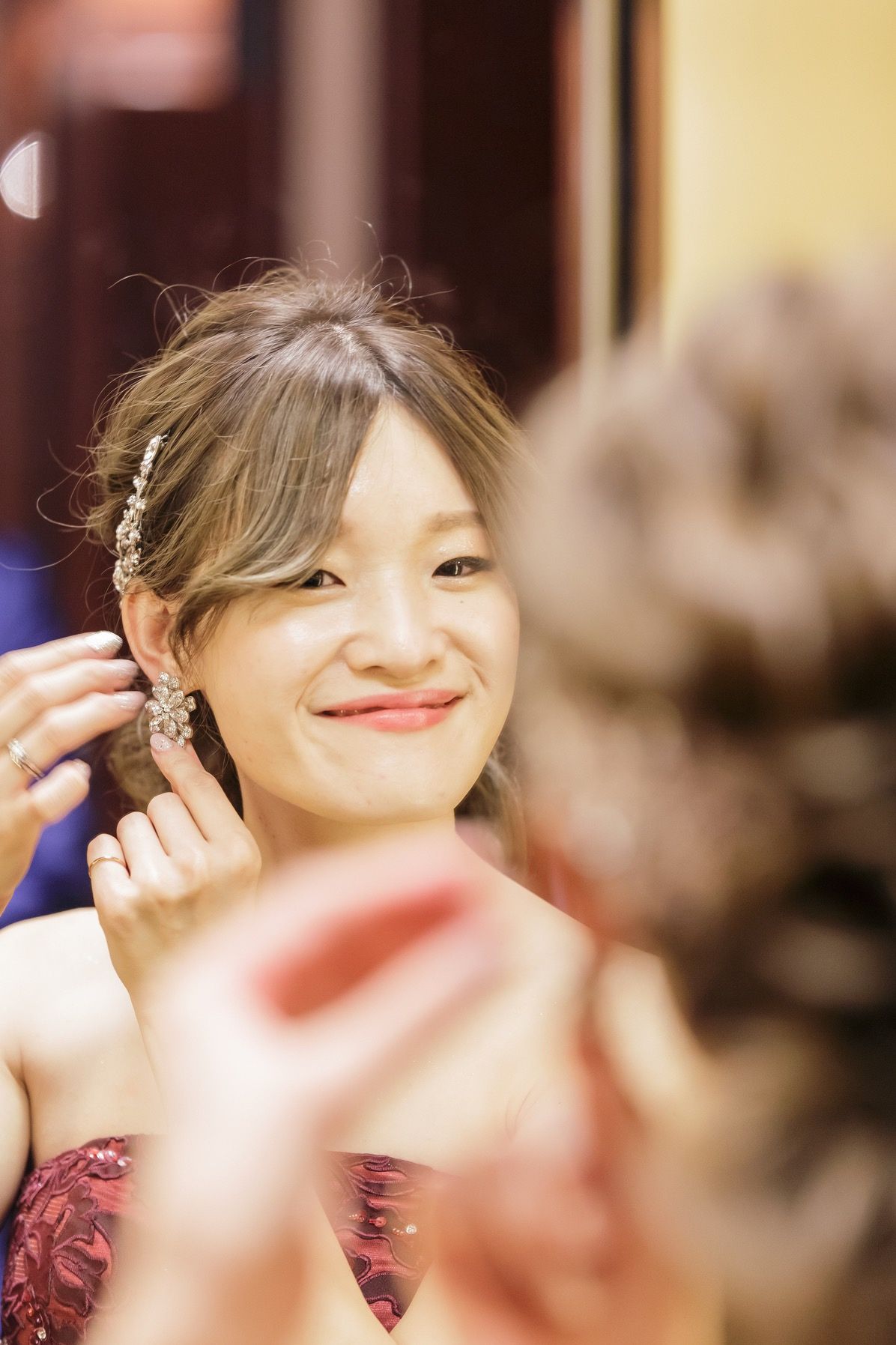 挙式は、花嫁と皇族しかつけられないというティアラをどうしてもつけたくて、ヘアから決めました。カラードレスは、ちょっとメイクを濃いめにして、キラキラ感を目一杯出しました。