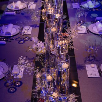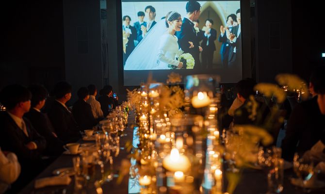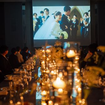 具体的なテーマはありませんでしたが、海外ウェディングのようなお洒落でにぎやかな雰囲気を取り入れたいという思いがあったため、披露宴会場に流しテーブルやキャンドルを取り入れて演出しました。