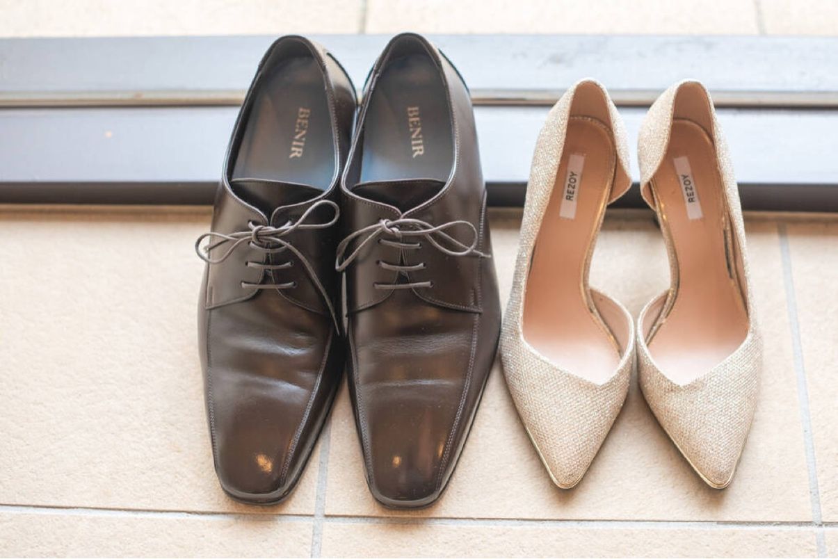 シャンパンゴールドのグリッターパンプスでヒールは6cmほどの高すぎないものを選び、歩きやすさを重視しました。