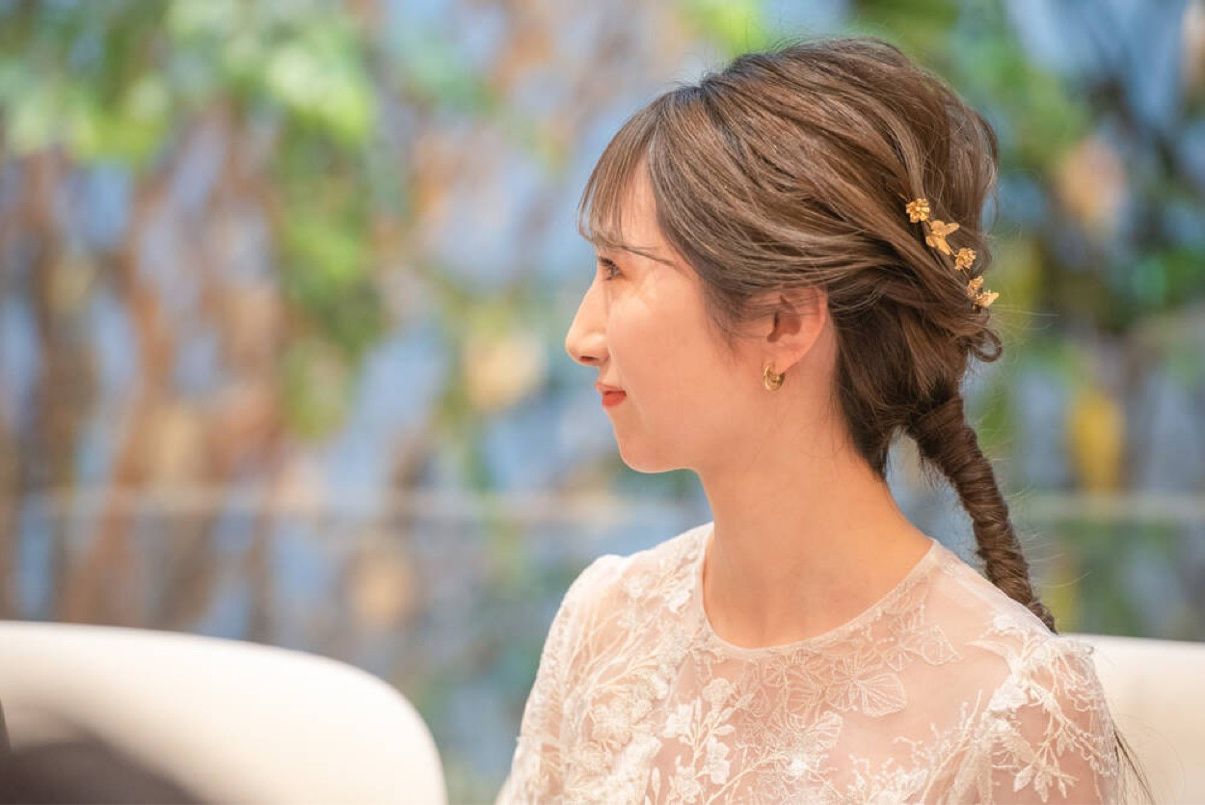 披露宴ではタイトめに編み下ろし、ゴールドのヘッドドレスを合わせて挙式と雰囲気を変える意識をしました!