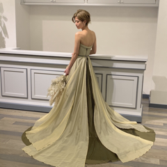 私が原色のカラードレスを着ると強い印象に見えてしまいそうでしたので、柔らかいカラーのもので探していました。動くたびにオーガンジーのスリットから覗く濃いカーキが素敵で他に無いカラーやデザインが気に入りこちらもすぐに決まりました!