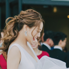 式はシニヨンにまとめたアップ。 ジェニファーベアのヘアアクセを後ろにつけました。 式は上品に、リップの色も抑えめ。今流行っている波ウェーブもつけずに大人な雰囲気にしてもらいました。