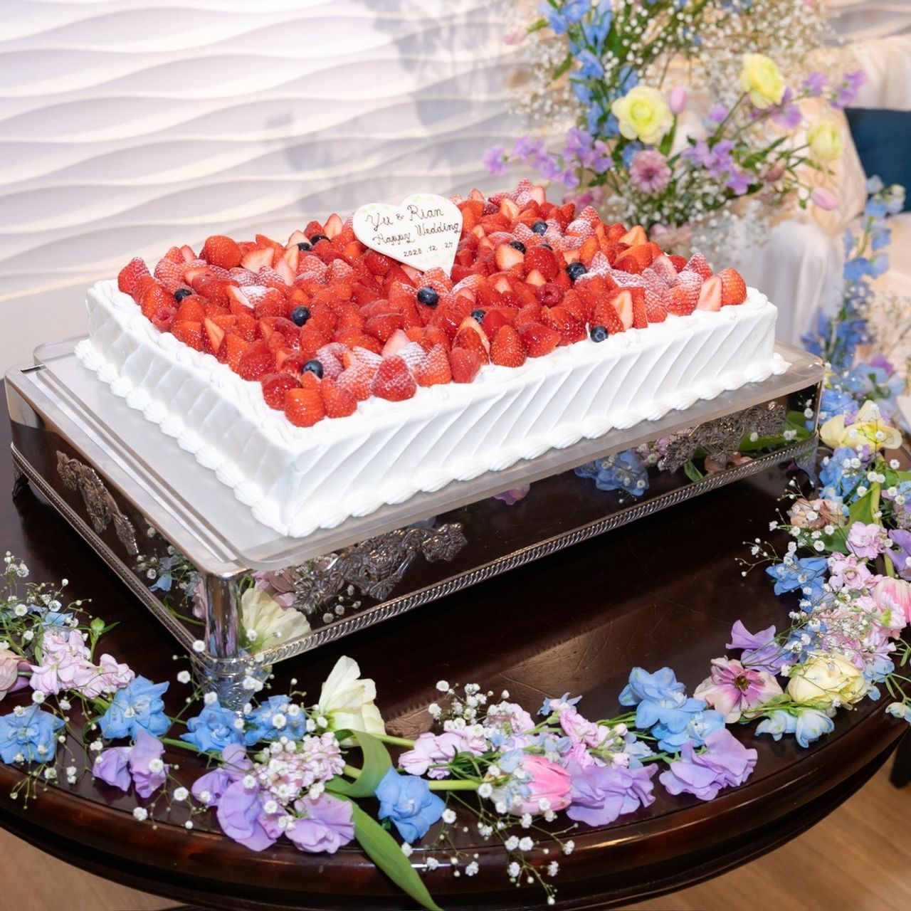 ゲストが食べきれる量にしたかったので、特に工夫はせず、シンプルな1段の四角いケーキにしました。