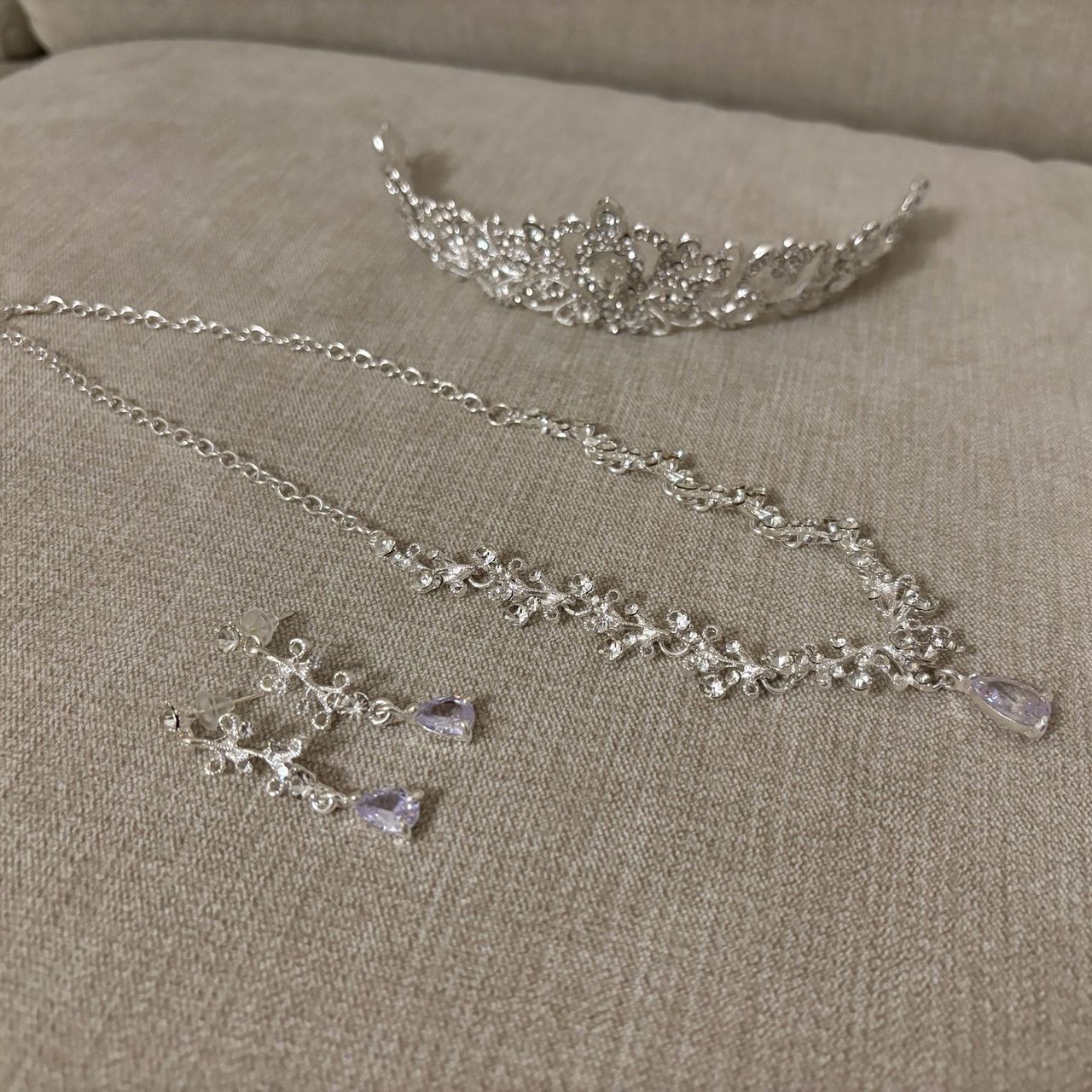 ウェディングドレスのときは、キラキラ宝石のネックレスとピアスで重厚感を出しました。