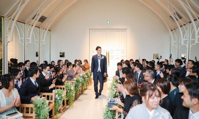 白を基調とした空間とゲストとの距離感を大切に考えました。せっかく綺麗な服で来て頂くゲストも そして主役の自分たちも映える様に、出来るだけ空間に色を使わないように しました。