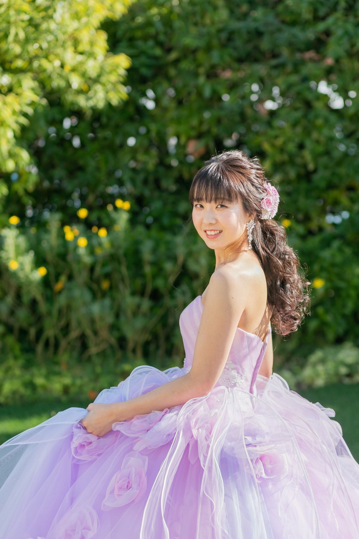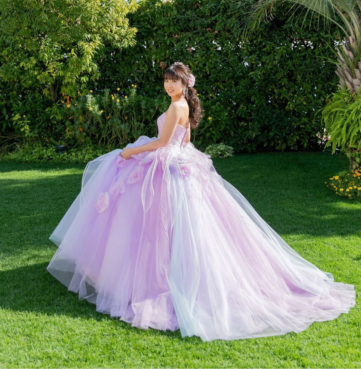 憧れのキヨコハタのドレスを選びました。ピンクラベンダーにブルーが入っていて、私の好きな色が全部入っていました。更に、チュールスカートがボリューミーで座ったときにふわっとした感じがとっても可愛かったです。