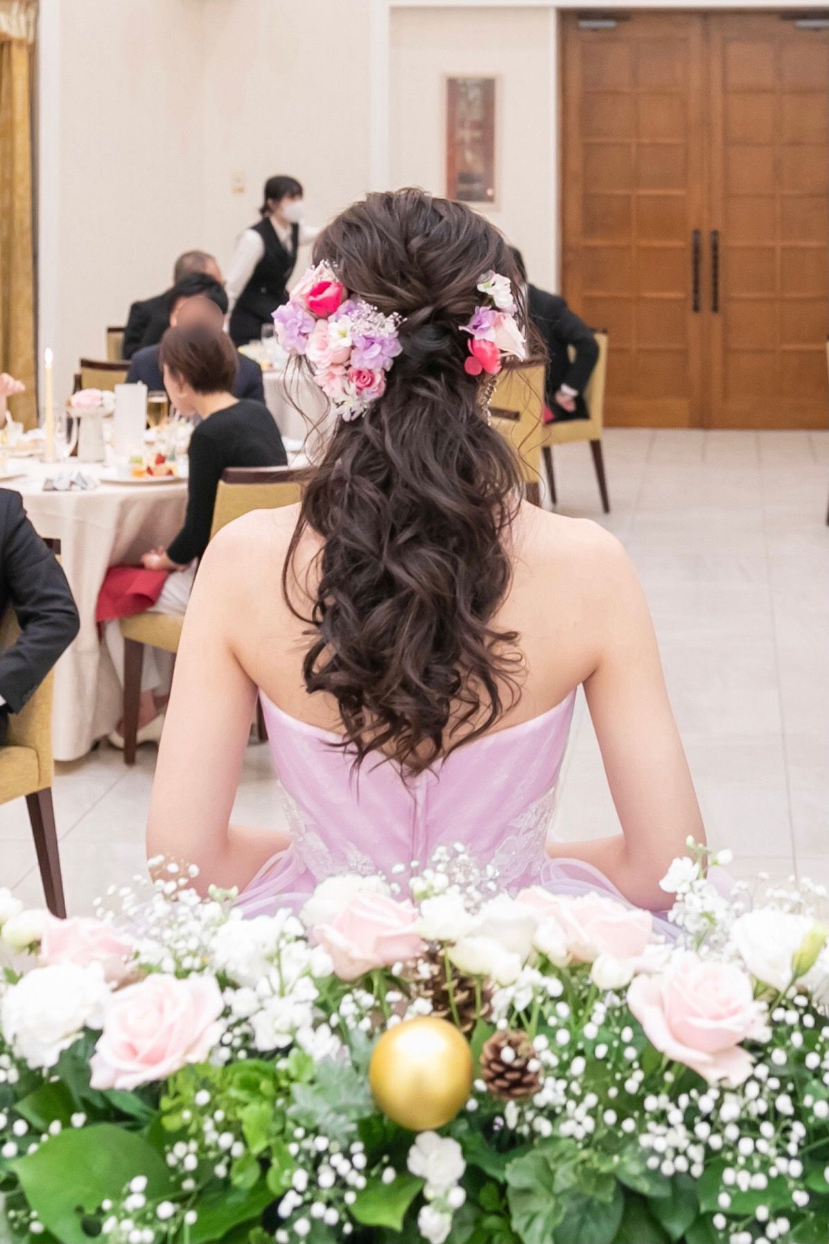 ドレスに似合うフラワーベッドドレスを付けました。リースブーケとお揃いで作っていただきました。