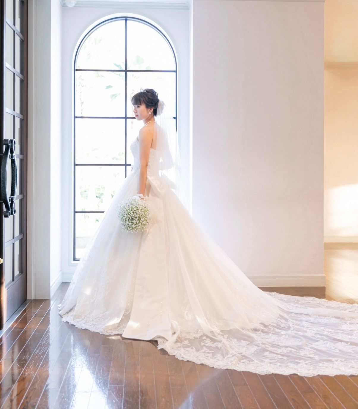ウェディングドレスはロングトレーン×刺繍が素敵なドレスを選びました。ウエストもスッキリしてスタイルが良く見えるデザインかどうかも意識して選びました。