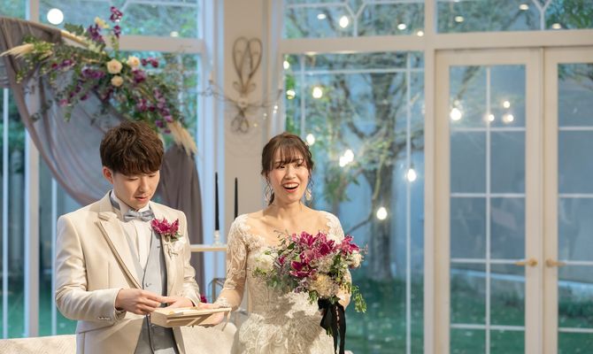 どうしても春だと可愛らしくなってしまうのですが、そういうのが苦手だったので、お花やドレスなどを大人っぽく、シックに。でも季節のお花を使ったり、春らしい色を所々盛り込んだりして、可愛くなりすぎない大人かわいい結婚式をつくることができました。