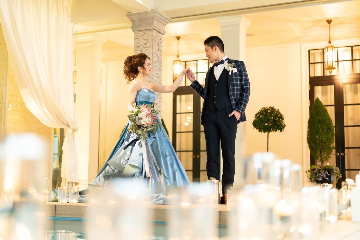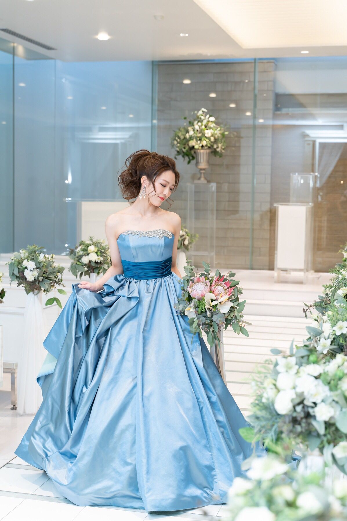 Pariniというドレスです。アクアガーデンテラスさんの会場雰囲気を見て、青にしたいと思いました。ウェディングドレスはチュールにしたので、カラードレスは雰囲気を変えたくてサテン生地にしました。
