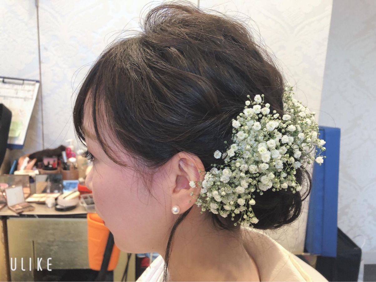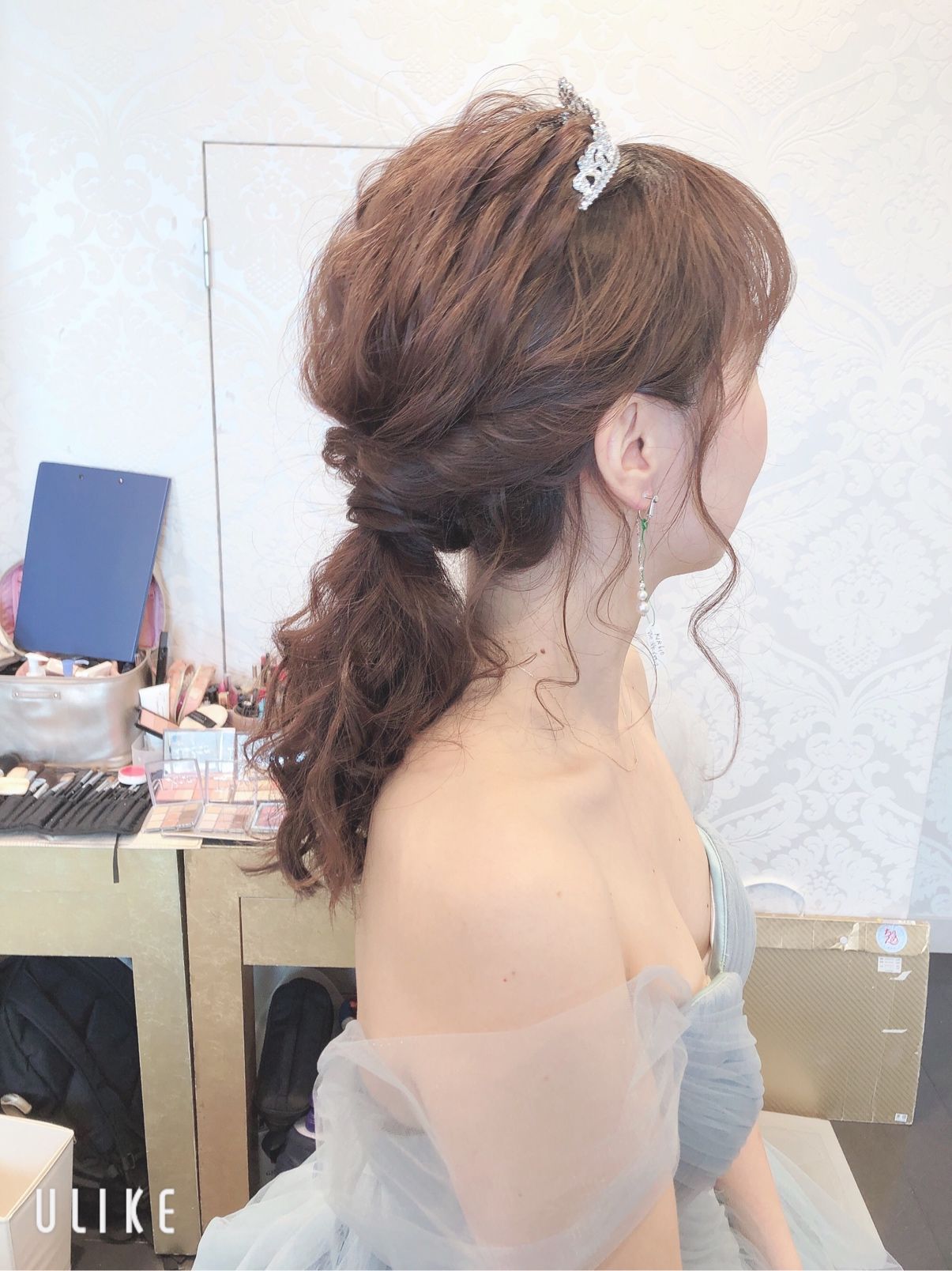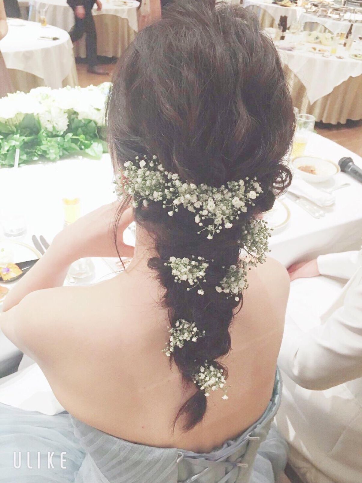 お色直しの時はローポニーにしてもらい、ふわふわ感を出来る限り出して頂きました♡二次会は、和装の時に付けて頂いたヘッドパーツをバラして頂き、編み込みに付けて頂きました♡女子から凄く好評でした!!