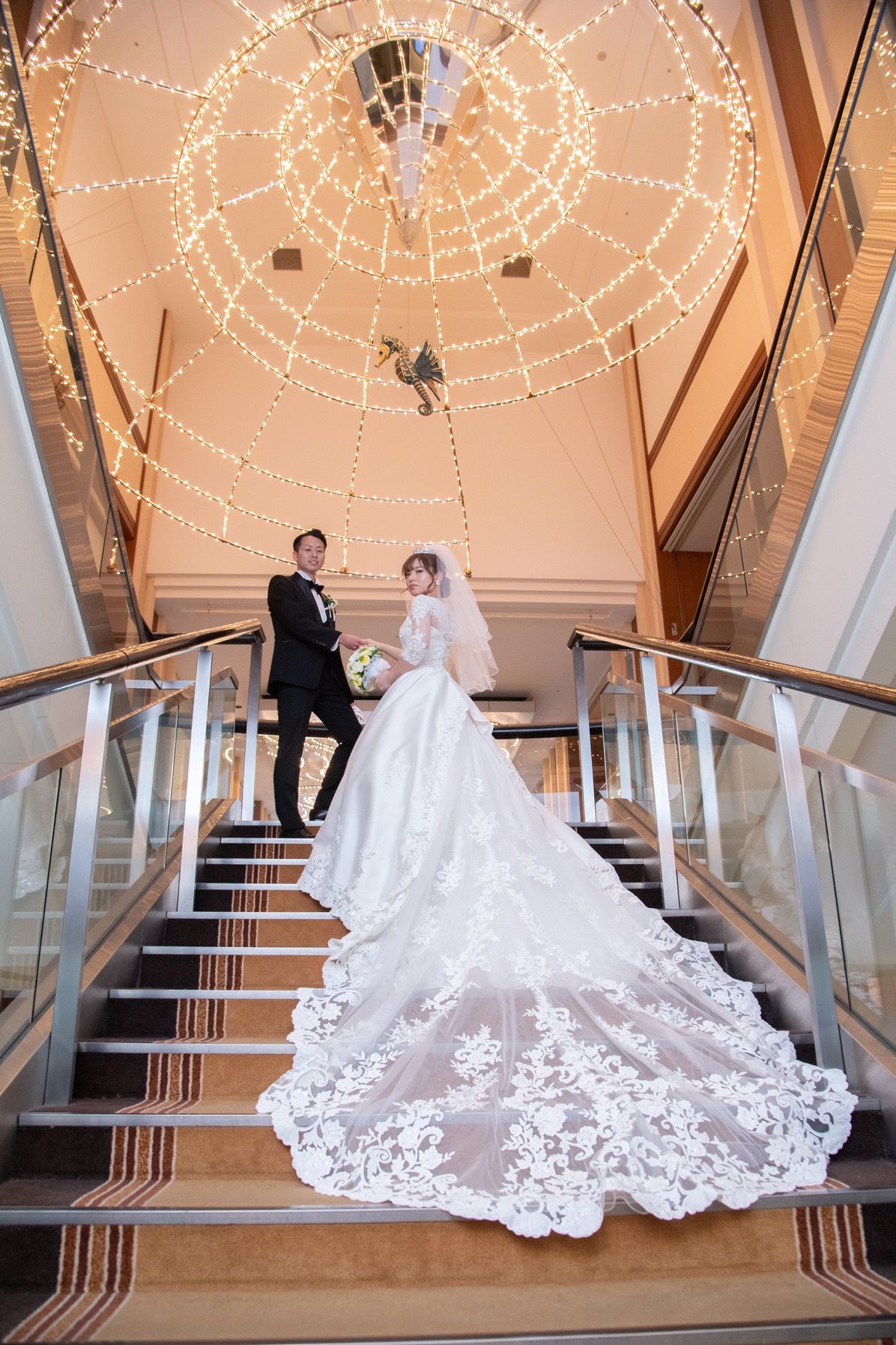 挙式では『ロイヤル』をテーマに、披露宴との対比を付けました。レース袖付きのウェディングドレス&王道の黒タキシードを選んだのがポイントです。