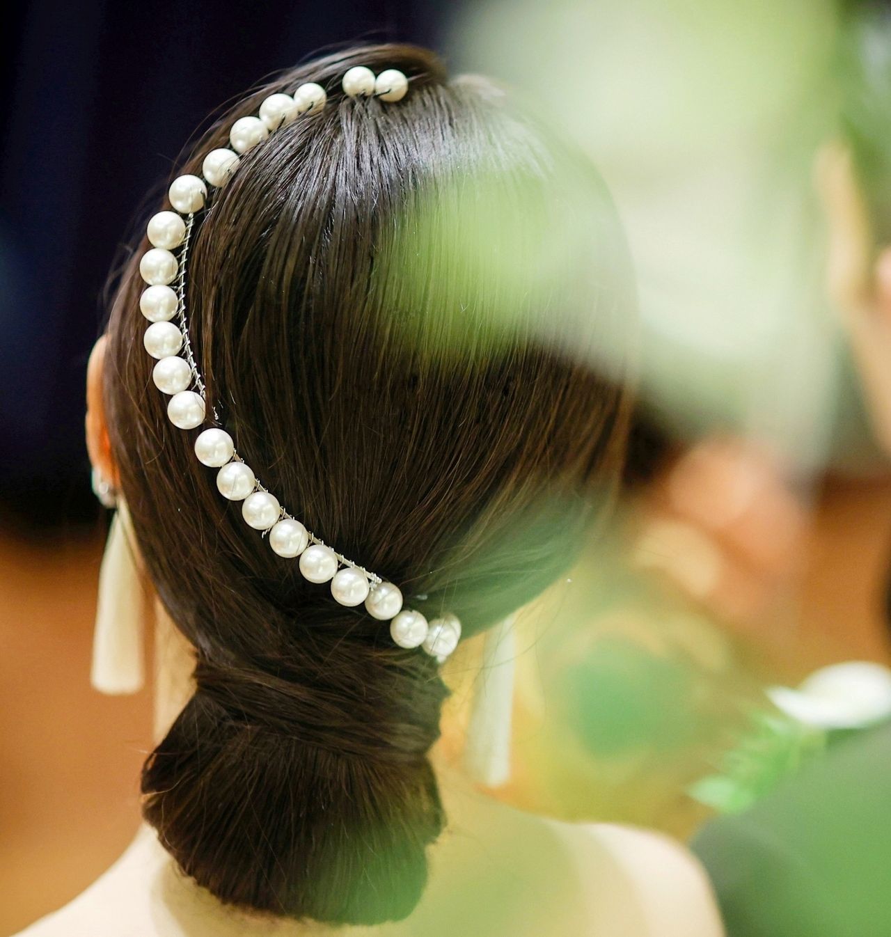 ウェディングドレス:パールのコームとUピンの組み合わせです。Pinterestで見つけたパールが流れるようなデザインに一目惚れして真似しました。