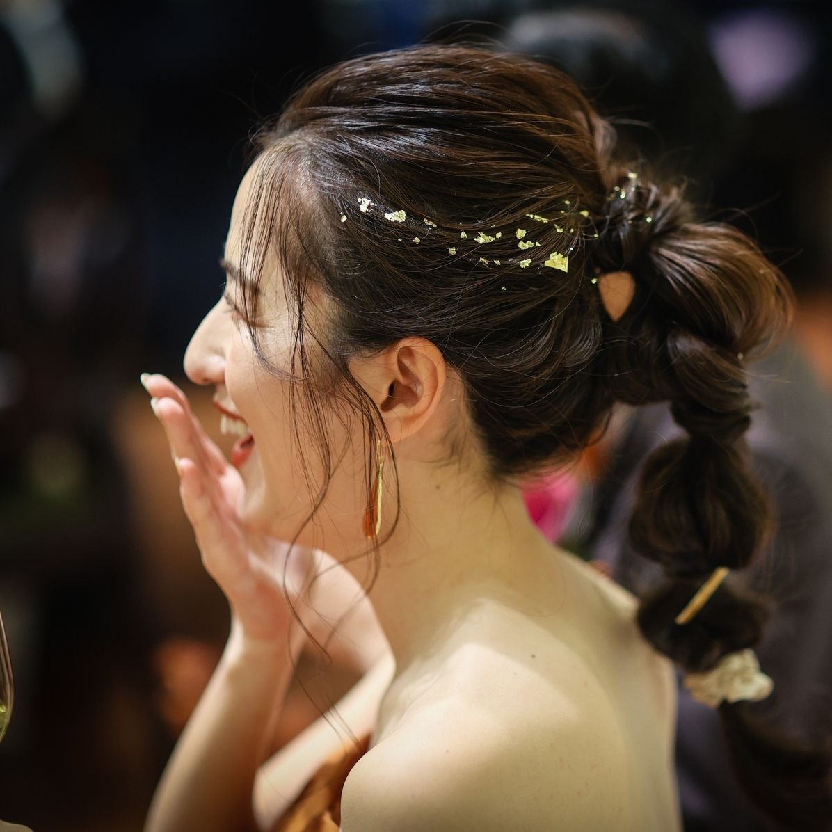 カラードレス:ウェディングドレスとの印象チェンジのため、華やかなドレスに合わせた玉ねぎヘア
