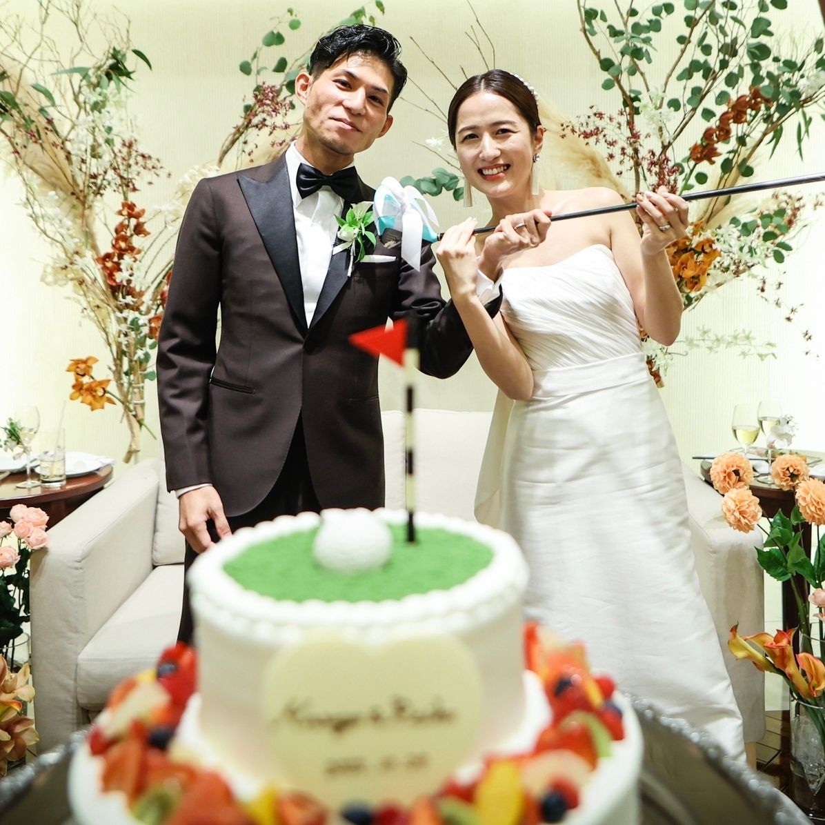 ゴルフが共通の趣味なので、前撮りや結婚式の中にもゴルフ要素を加えました。