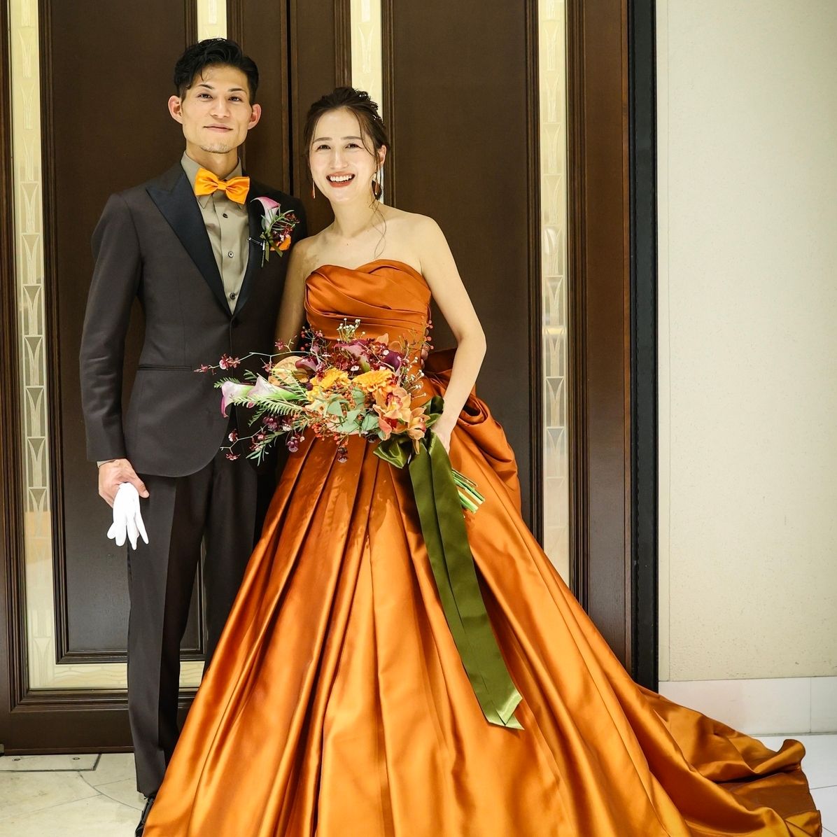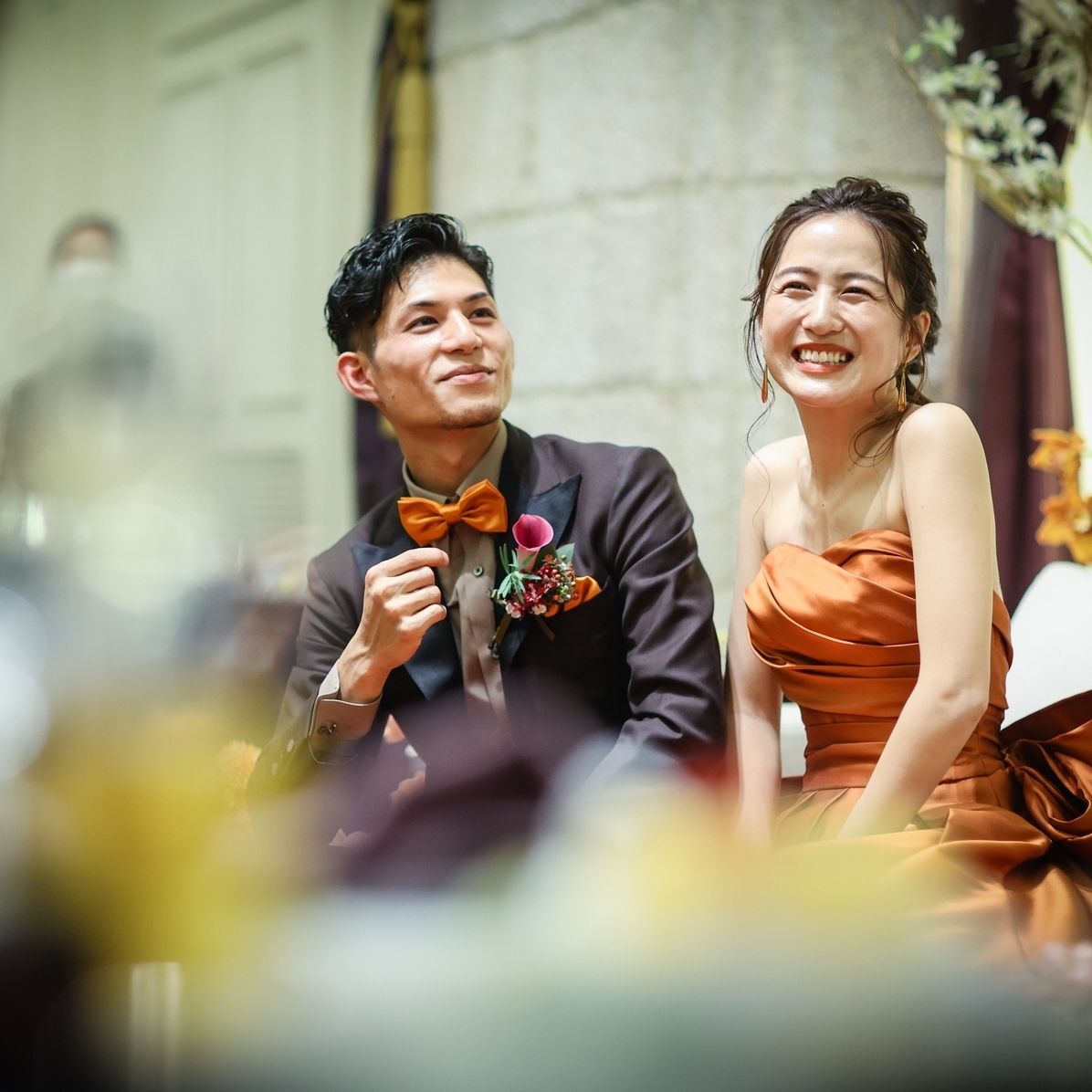 高砂:カラードレスと同じオレンジ色を使い、秋らしいイメージにしました。