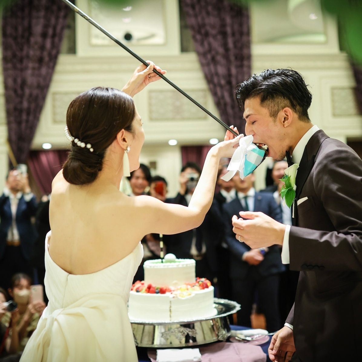 夫婦共通の趣味であるゴルフをイメージして作ってもらい、ゴルフのドライバーでファーストバイトの演出を入れました。