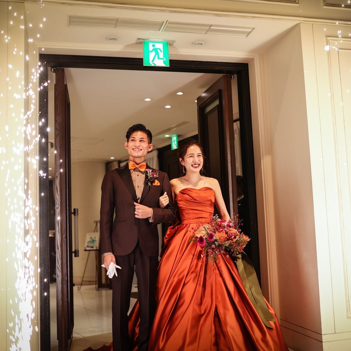 カラードレス:金箔や金色のピンを使い、テラコッタとも相性がいいゴールドを合わせて、華やかにしました。