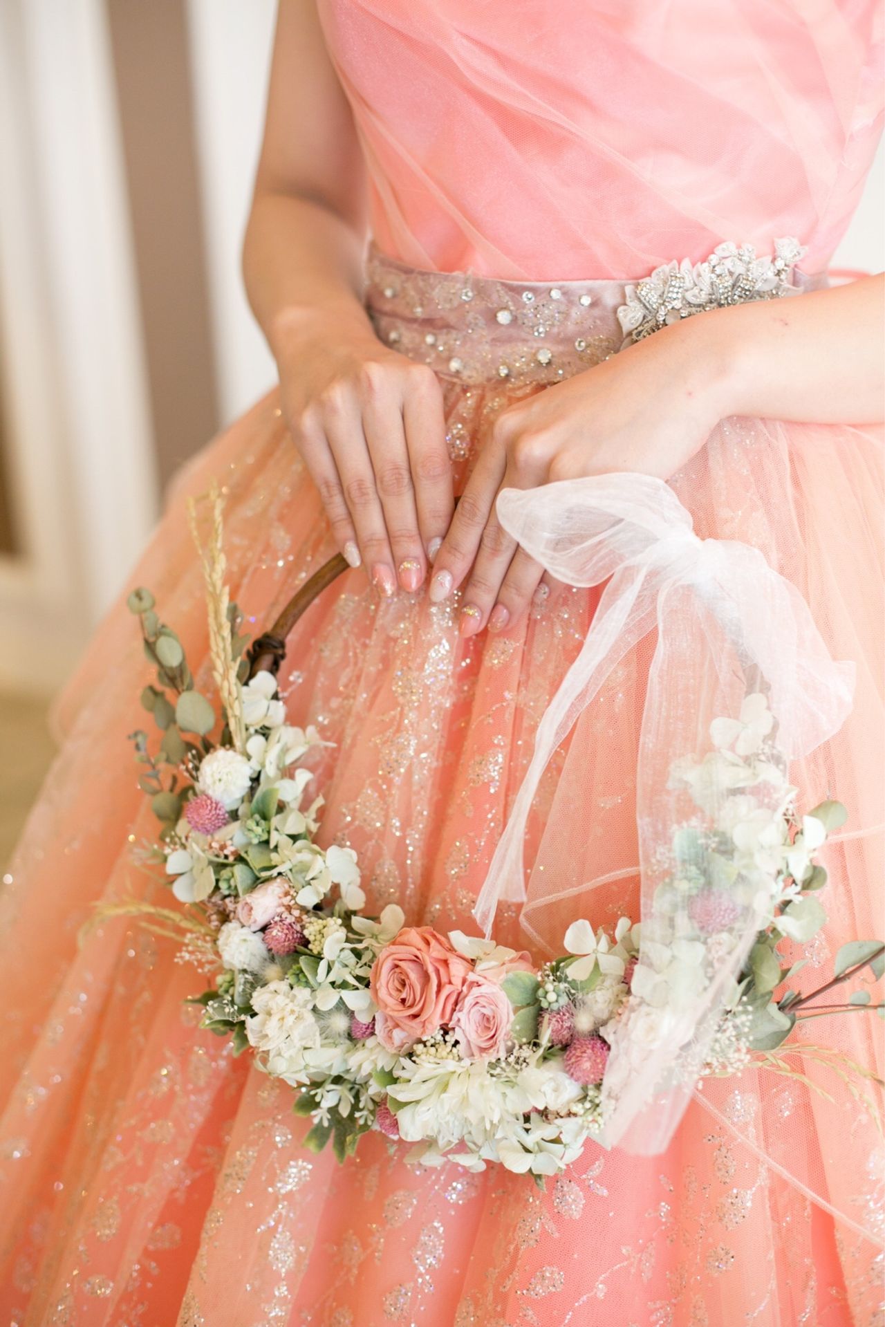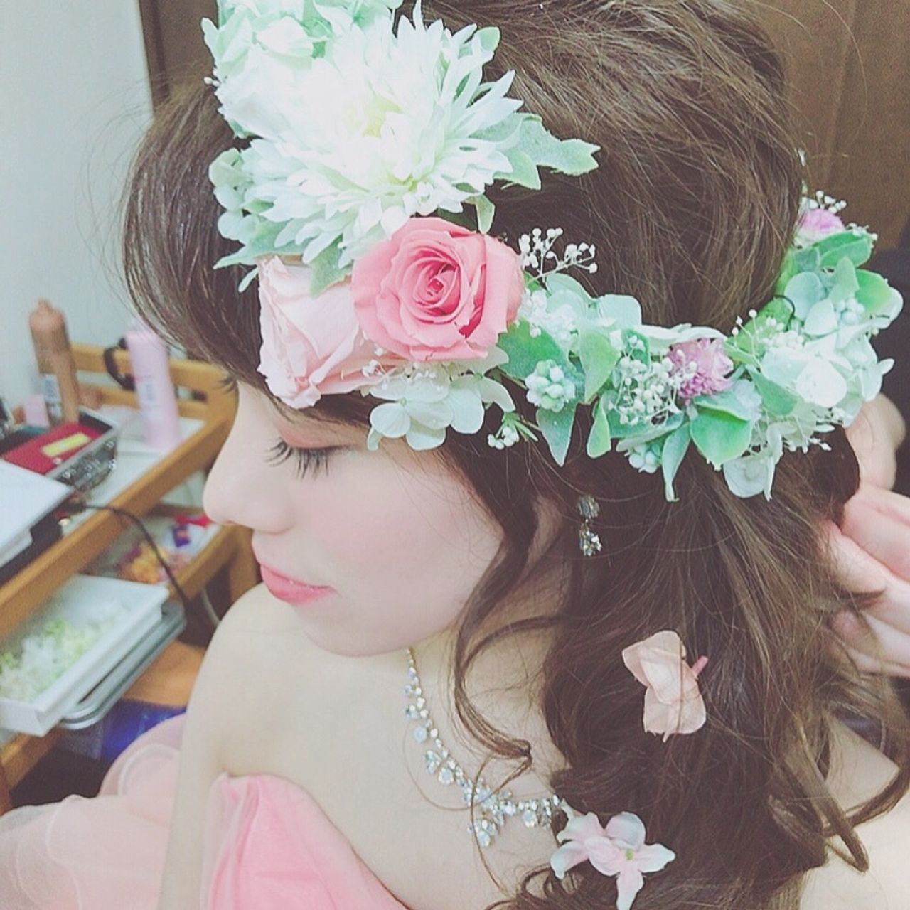 サーモンピンクのドレスに合わせてリースブーケと花かんむりをお揃いで作りました♡