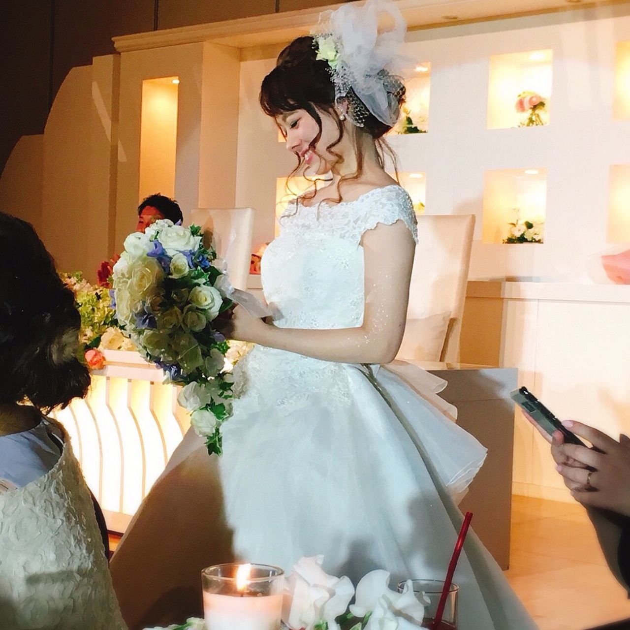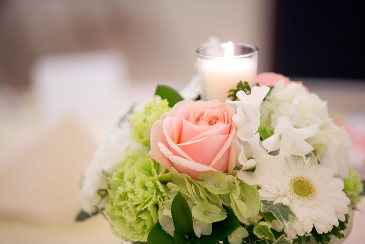 テーブル装花にはキャンドルをいれてもらい、かわいらしい雰囲気に。、