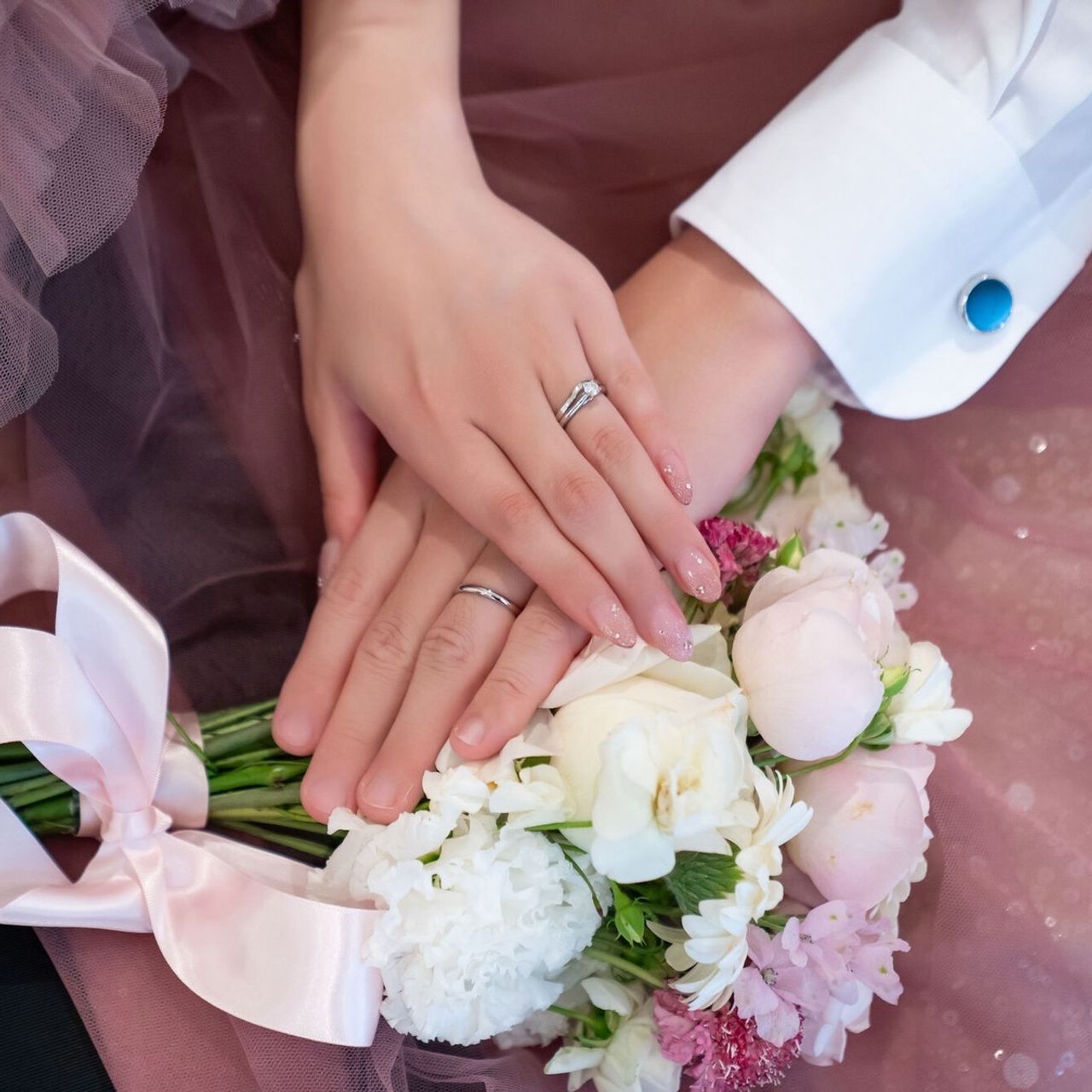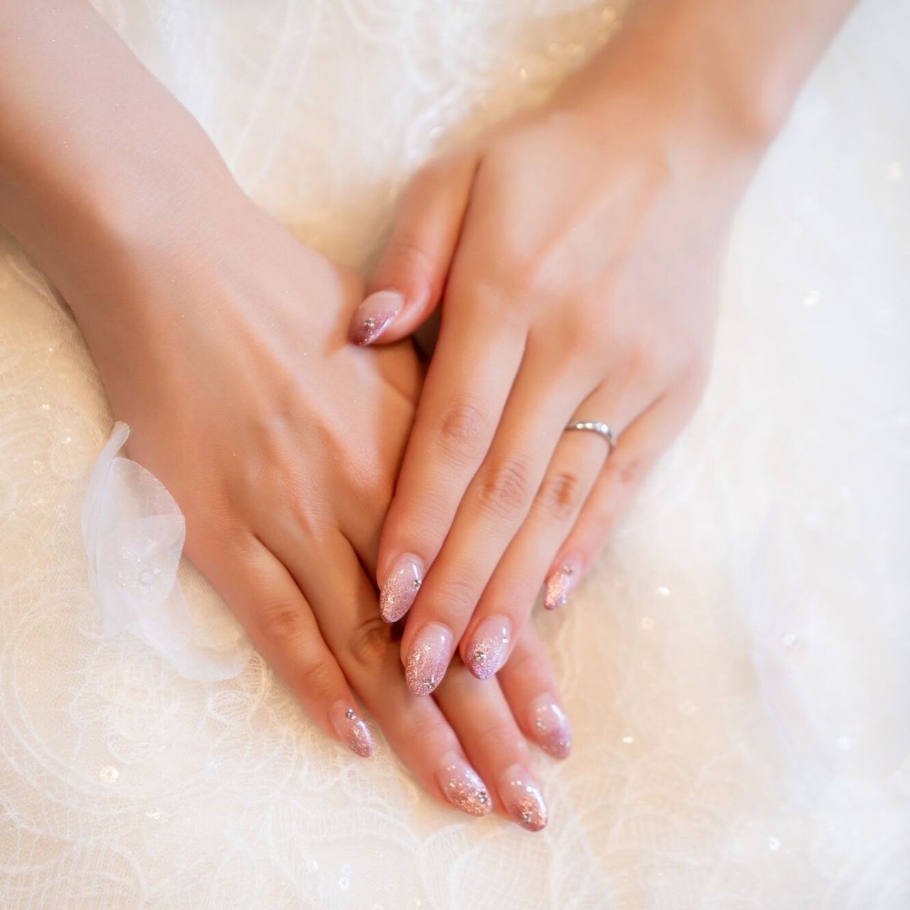 ネイルは指輪が映えるようにピンクのグラデーションであまりビジューをつけず、シンプルにしました。