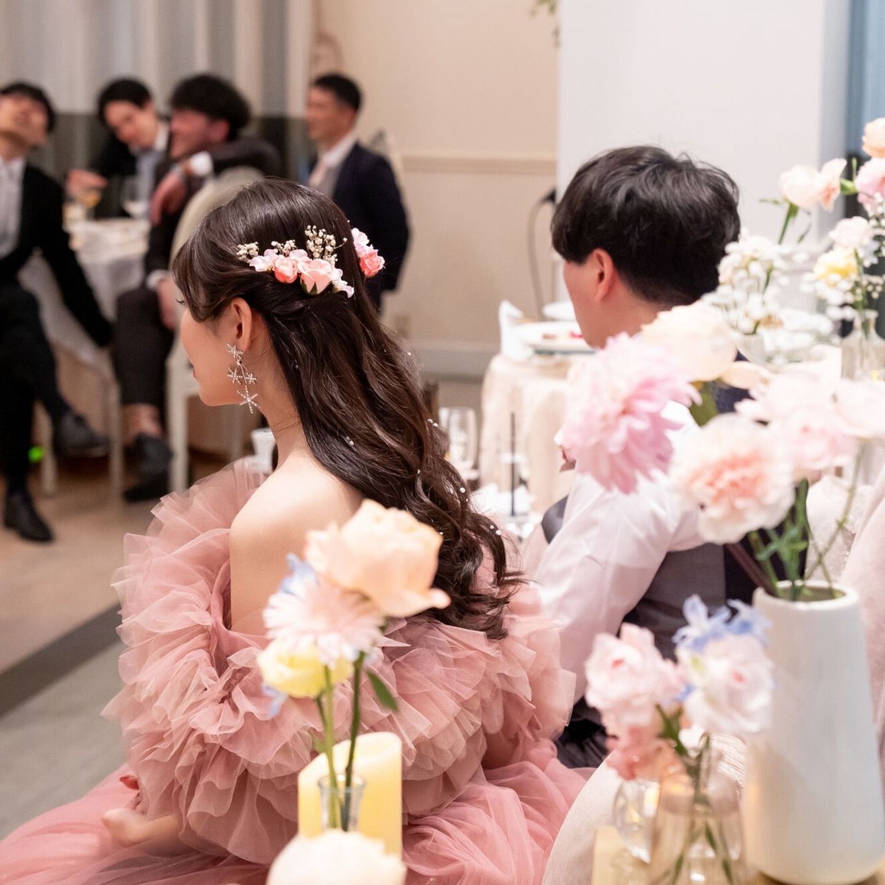 カラードレスはアーティシャルフラワーの花飾りをドレスのカラーに合わせて作ってもらい、前から少し見えるくらいで配置をお願いしました。