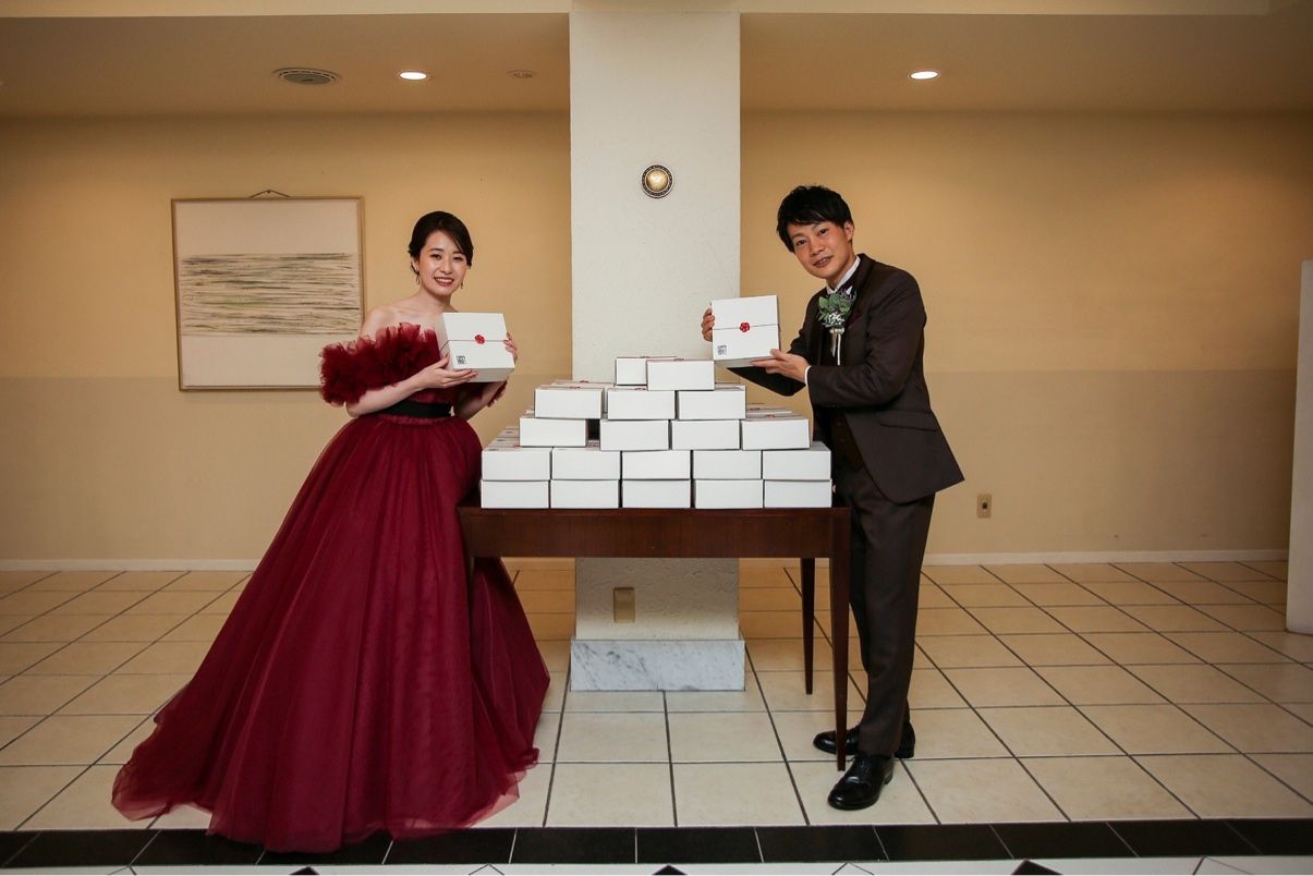 ゲストがオードブルを食べ終わってから会場スタッフさんに洗浄&箱詰めまでお願いし、お見送りの際にお渡しました。