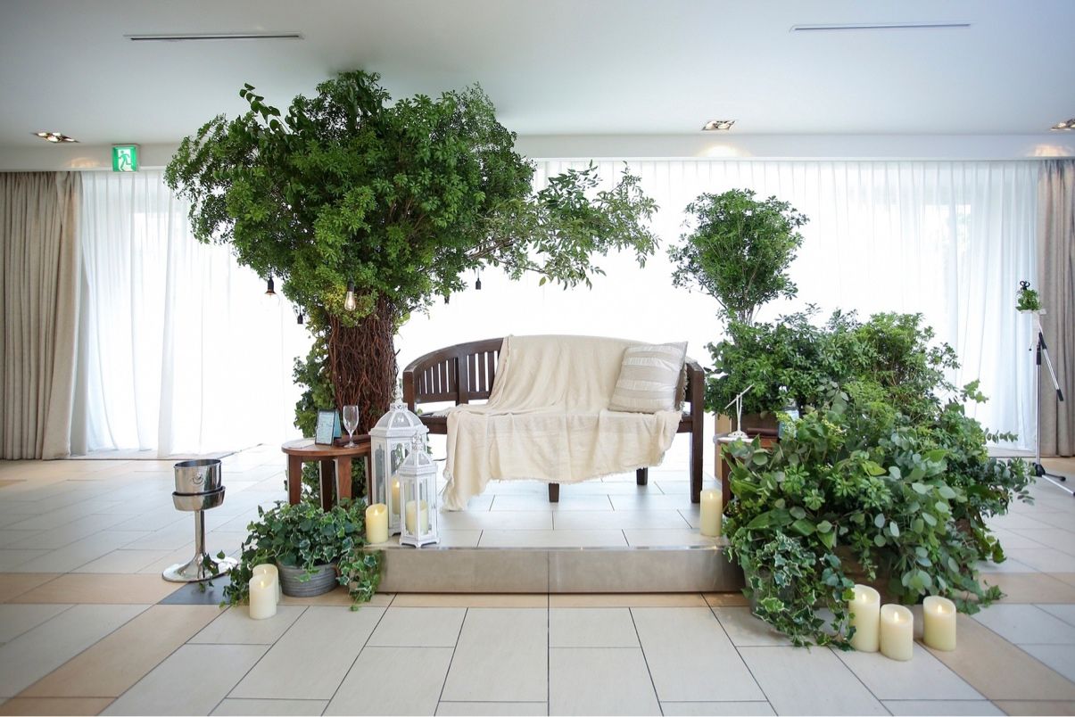 “森の中のレストラン”をコンセプトに、ソファコーデでお願いしました。ソファは木のベンチを使い、ガーデンウェディングをしているかのような雰囲気にしてもらいました。