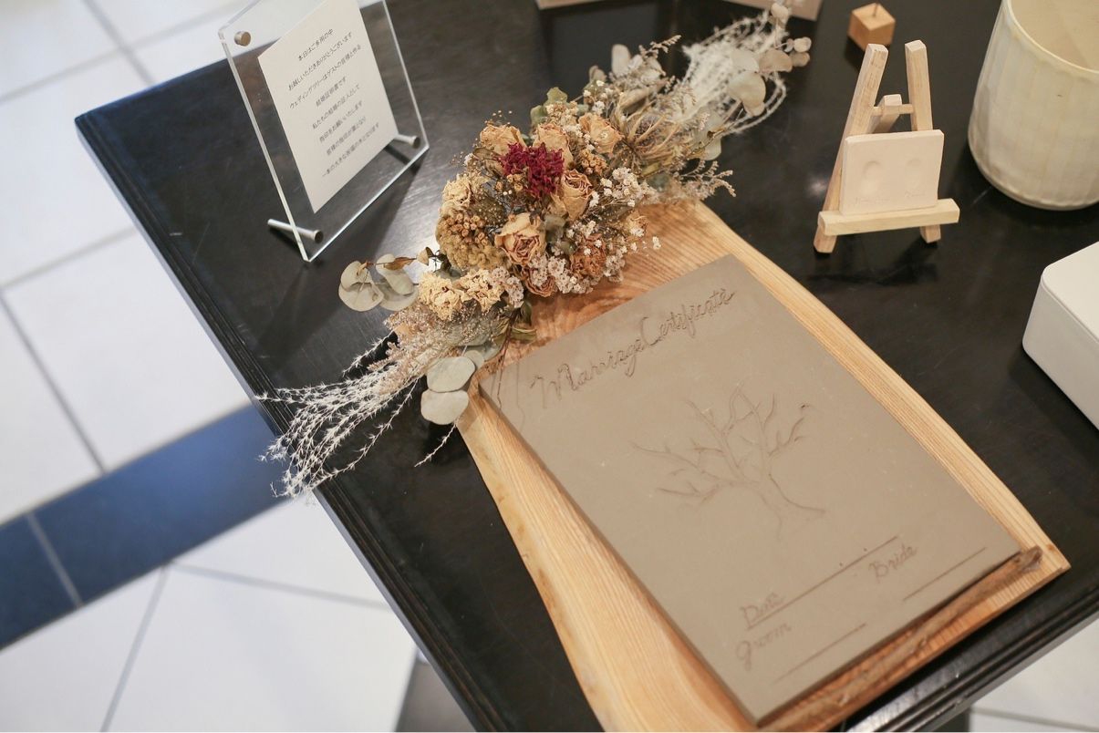 新郎の趣味が陶芸だったため、多くのアイテムを陶芸で作りました。結婚証明書は焼成前の土にウェディングツリーの絵を描き、ゲストに捺印してもらいました。そこにサインをし、後日焼成して完成させました!ウェルカムスペースのフラワーベースも陶芸で作成したものです。