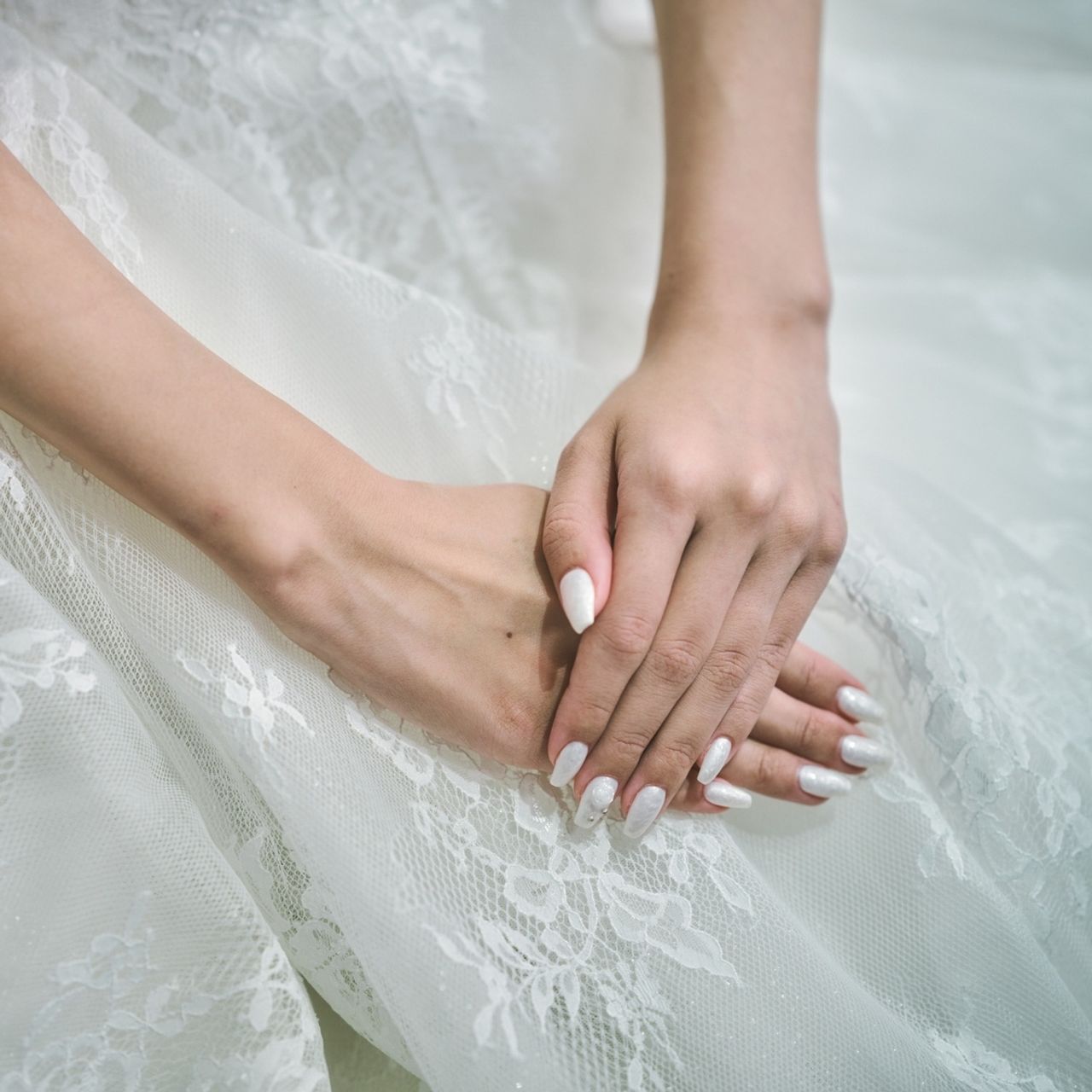 ドレスが際立つようにシンプルなデザインにしつつも、薔薇とストーンを少しだけパーツで載せて、指先まで華やかな印象になるように仕上げて頂きました。
