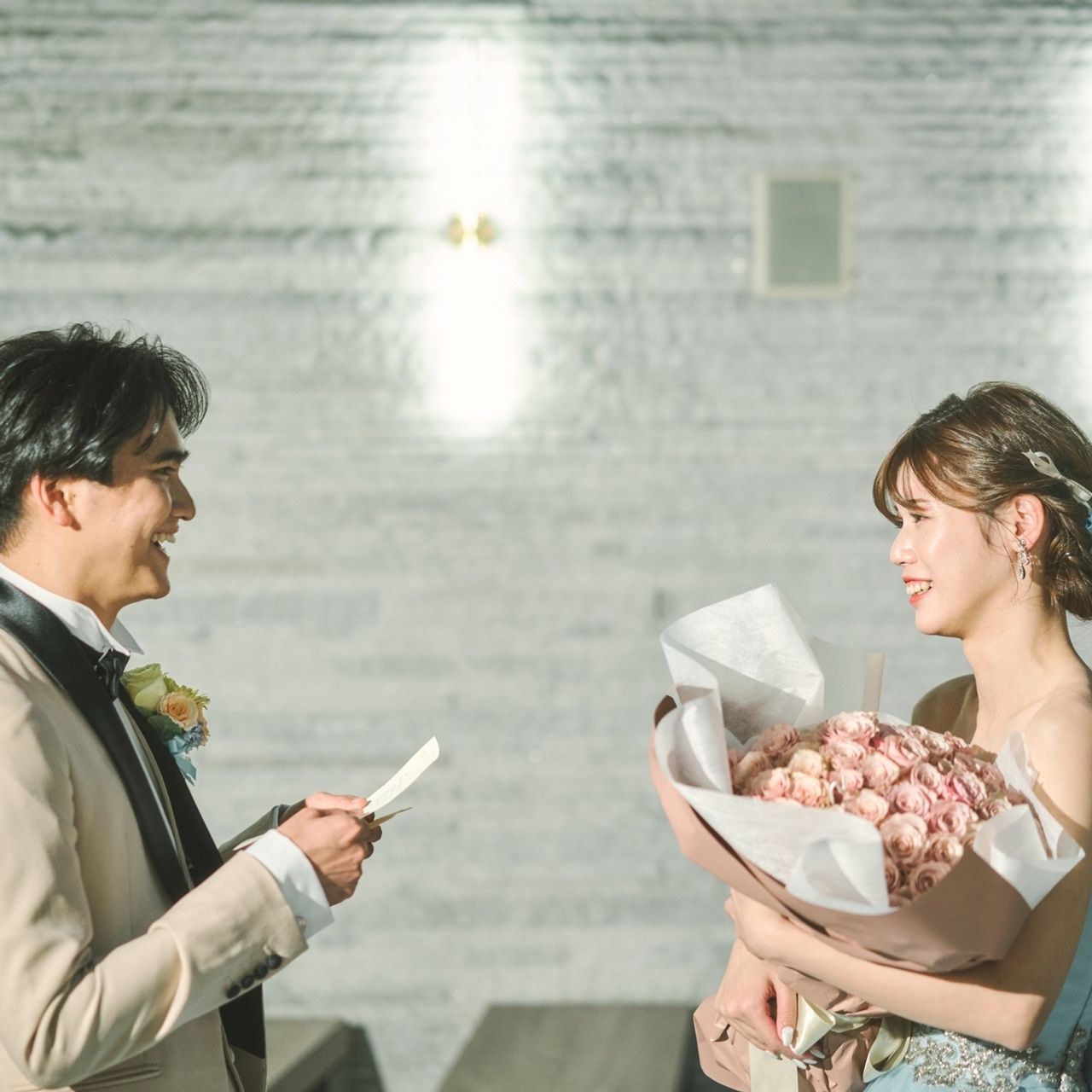 結婚式が終わり参列者を見送った後、チャペルで写真撮影をして頂いていたところに花束とネックレスを持った夫が現れ、お手紙を読んでくれました。