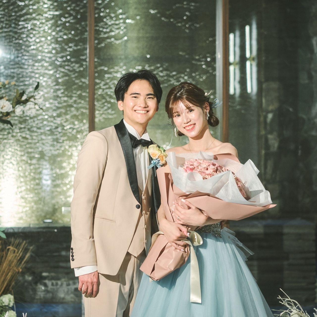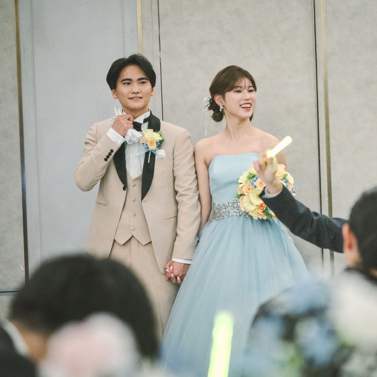 リボンの色は私のカラードレスの水色と新郎のタキシードのベージュを組み合わせ、2人のコーディネートに統一感が出るようにこだわったこともお気に入りです。