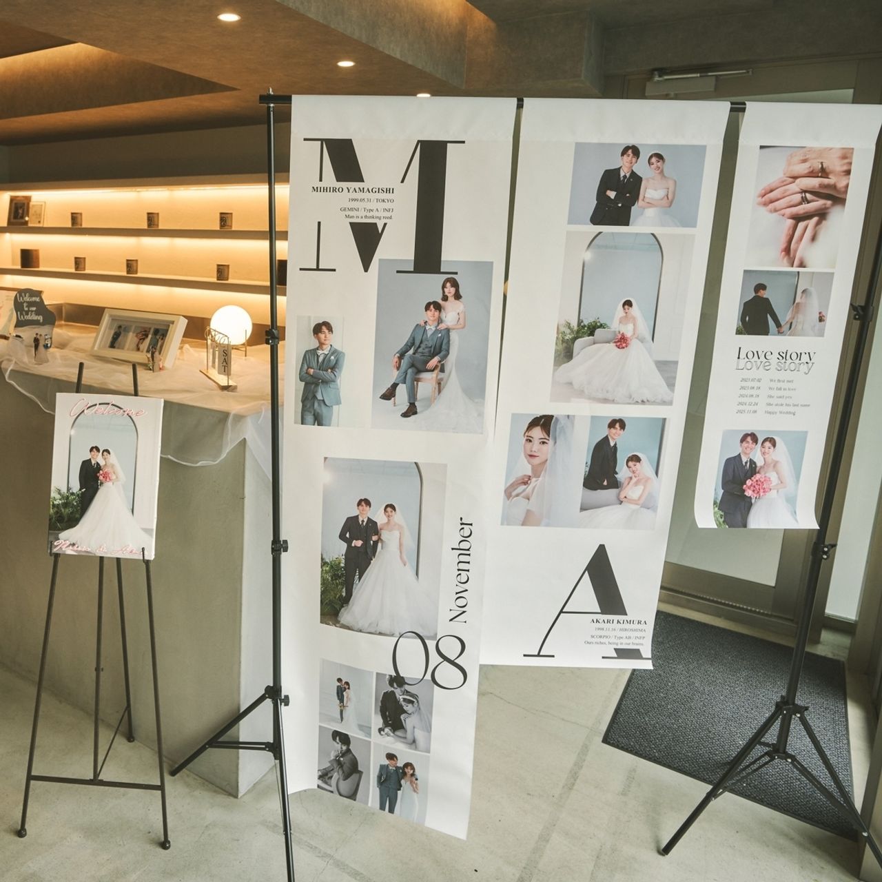 ウェルカムスペースには私達の写真や似顔絵を沢山置いてフォトスペースを作ったり、華やかで特別な1日の中に普段の2人が沢山垣間見えるよう、気取り過ぎない結婚式に出来るよう心掛けていました!