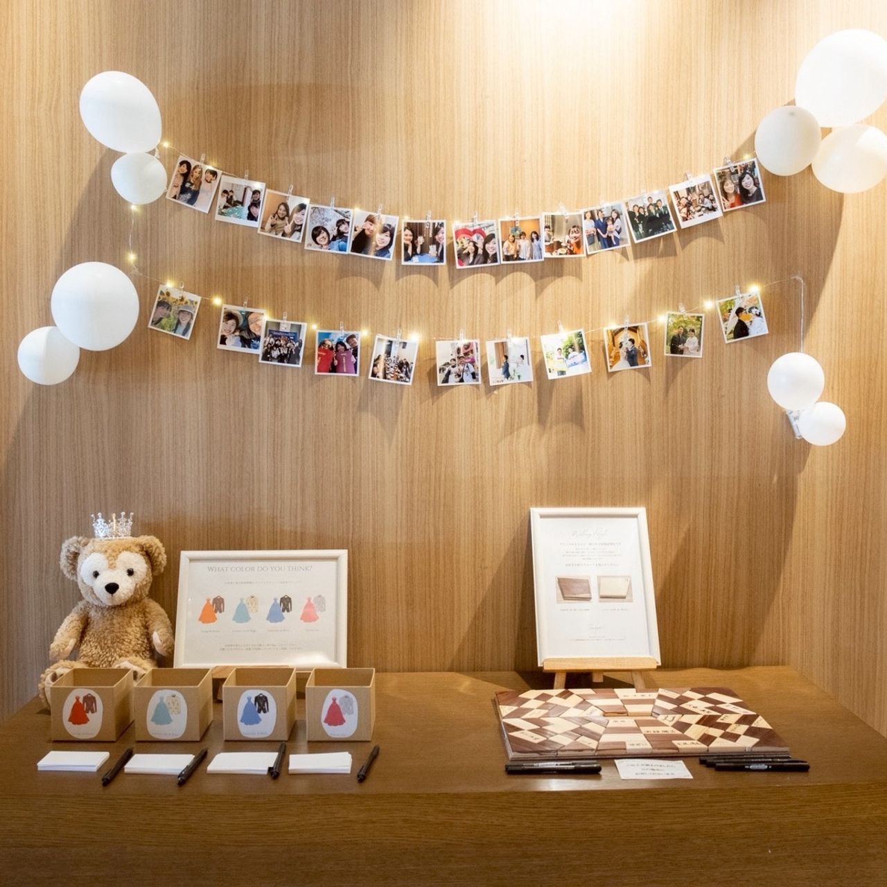 ウェルカムスペースは、ゲストに楽しんでもらえるよう、思い出の写真や、夫が木で作った結婚証明書のパズルなどを飾りました。担当プランナーさん、ヘアメイクさんなど、式場のスタッフさんから、結婚証明書のパズルピースに名前とメッセージを書いていただき、とても嬉しかったです。