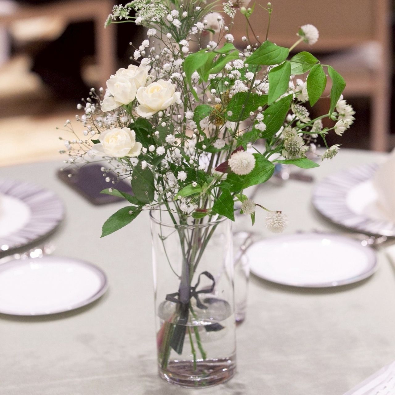 カスミソウなどの白い花や緑の葉を多めに使い、シンプルに仕上げてもらいました。白と緑でまとめたシンプルさがポイントになっています。