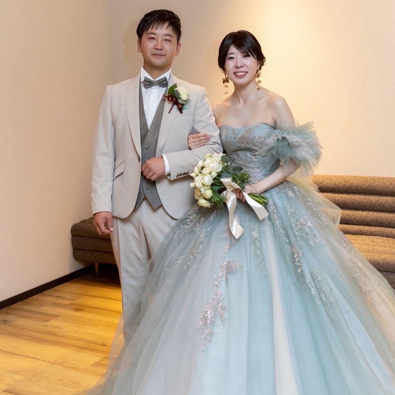 くすみシアンのドレスは、色味が一番気に入ったポイントです。また、ボリュームのあるオフショルダーのデザインも可愛いと思いました。
