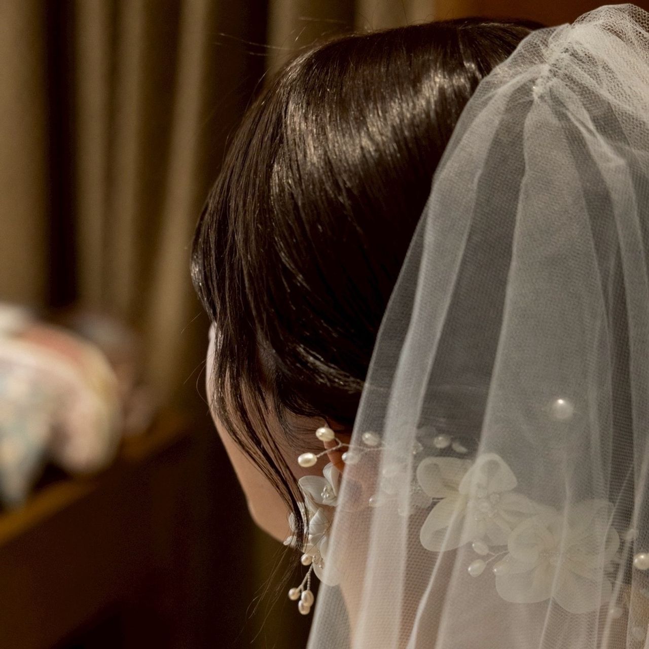 ウェディングドレスの際は、白い花とパールピンを合わせて、カラードレスの際は、金色の葉っぱや花モチーフのヘッドアクセサリーをつけています。