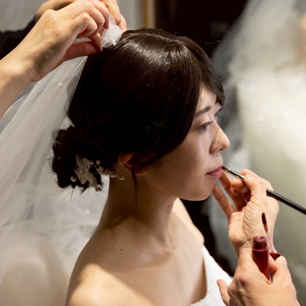 ウェディングドレスの際はシニヨンヘアにし、カラードレスでは編みおろしにチェンジして、雰囲気を変えてもらいました。