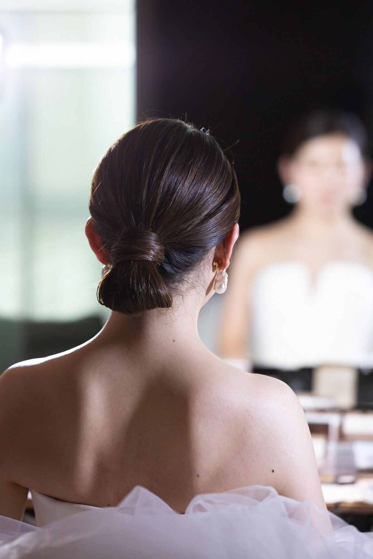 1着目はかっこよくモダンな雰囲気にしたく、タイトなシニョンにしていただきました。2着目はカジュアルダウンさせたかったので、後れ毛を少し出して、不規則な編み込みをしてもらいました。