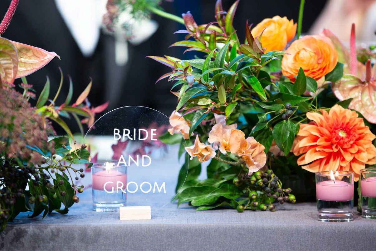 オレンジを中心に、くすんだ色味でまとめていただきました。無造作な感じが好きだったので、高砂も左右非対称にしてもらいました。