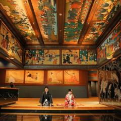 赤い絨毯に壁と並行に長く置かれた参列者用の椅子は昔ながらの神殿という感じでした。両側の壁ともに一枚の板を掘り、凹凸を出している素晴らしい彫刻で、右側は男性の力強さを、左側は女性の優しさや柔らかさを表していると伺いました。 大巳殿を初めて見学した際、素敵な式場に心惹かれました。また赤い絨毯が白無垢をより際立たせてくれたような気がします。