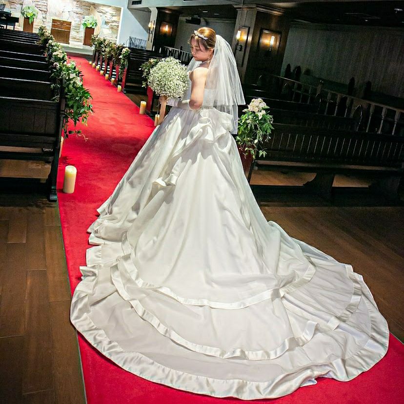 チャペルがシックな雰囲気なので、チャペルに負けないような綺麗めなハリのあるドレスを選びました。