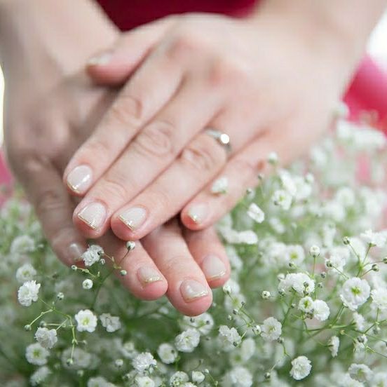 何でも似合うように乳白色のマグネットネイルにし、先端はゴールドのフレンチを入れました。