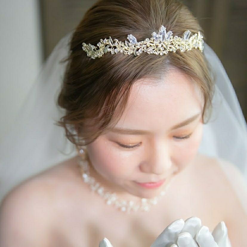 ウェディングドレスはハリのある上品なドレスにしたので、髪も少しタイトにしてもらい、ゴールドのラメを使用し、大人っぽさを出してもらいました。