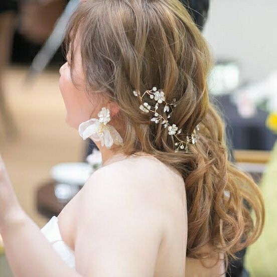 挙式ではティアラ、披露宴では小さなお花を散りばめたベッドアクセサリーを使っています。