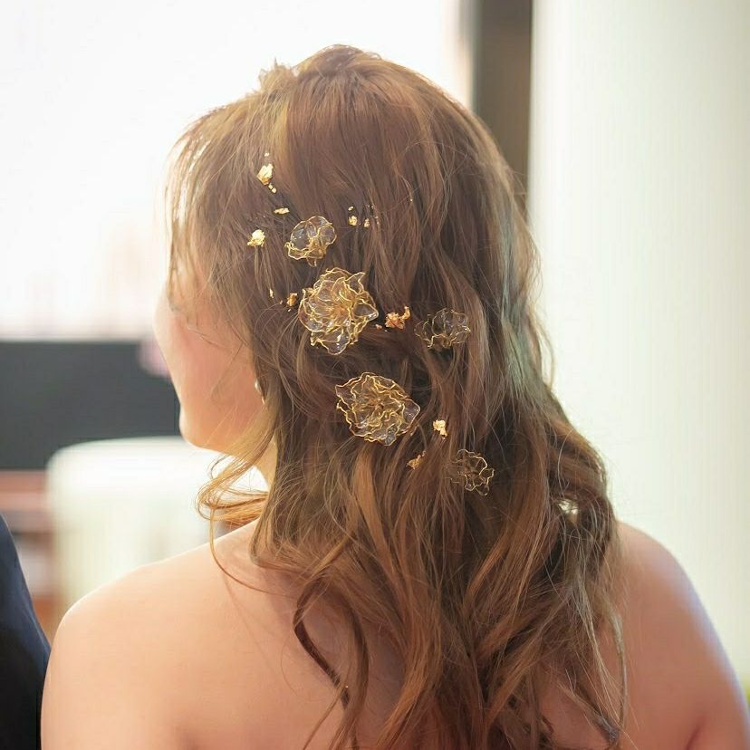 お色直しではディップアートのゴールドのお花と金箔を散りばめました。